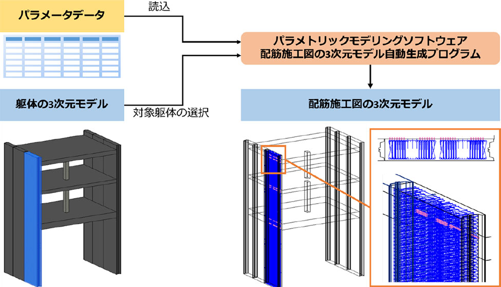 開発したプログラムは、BIM/CIM関連のシステム開発を手掛けている(株)GELの協力を得て構築したもので、躯体のBIM/CIMモデルに鉄筋径やピッチ、形状等の必要情報を整理したパラメータデータを取り込むことで、配筋施工図の3次元モデルを生成します。具体的には、配筋情報を入力したパラメータデータをパラメトリックモデリングソフトウェア「Rhinoceros Grasshopper」に読み込み、プログラムを実行するだけで、BIMソフトウェア「Revit」上に施工図情報を反映した3次元モデルが構築されます。また、パラメータデータの入力値を修正することで、3次元モデルの形状を容易に変更できるため、モデルを適宜修正しながら施工検討を進められるようになります。