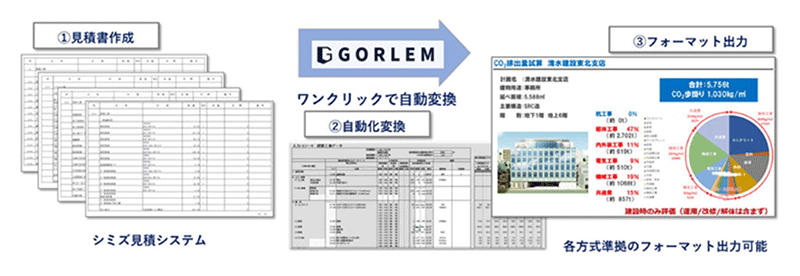 脱炭素のためにはCO2排出量の把握から進める必要があります。 CO2排出量算出プラットフォームShimz Carbon Assessment Toolは、建設生産過程で生じるCO2排出量を精算見積データから自動算出できるシステムです。本プラットフォームにより、一連の算出プロセスが自動化されることで、建設生産過程におけるCO2排出量算出のハードルが大きく下がり、発注者へのCO2排出量の報告・データ提供を標準化することが可能になります。建築物の企画設計段階でも本プラットフォームを活用し、影響度の高い主要項目に絞って設計案のCO2排出量の簡易評価を行うことで、定量的な評価に基づく低炭素建築物の設計提案を進めていきます。