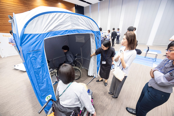 また、災害時に最も重要となる連絡体制については、作業所の通信が途絶した状況を想定したうえで、可搬型災害用無線機や衛星通信サービスなど複数の通信手段を用いた訓練を実施し、連絡体制の実効性を確認。さらに、中央区や近隣企業と連携して帰宅困難者受入訓練を実施。外国人や障がい者など要配慮者の受入・運営体制の確認に加え、簡易ベッドや障がい者用トイレの組立等の体験を通じて、地域一体となった震災対策体制の強化を図りました。
