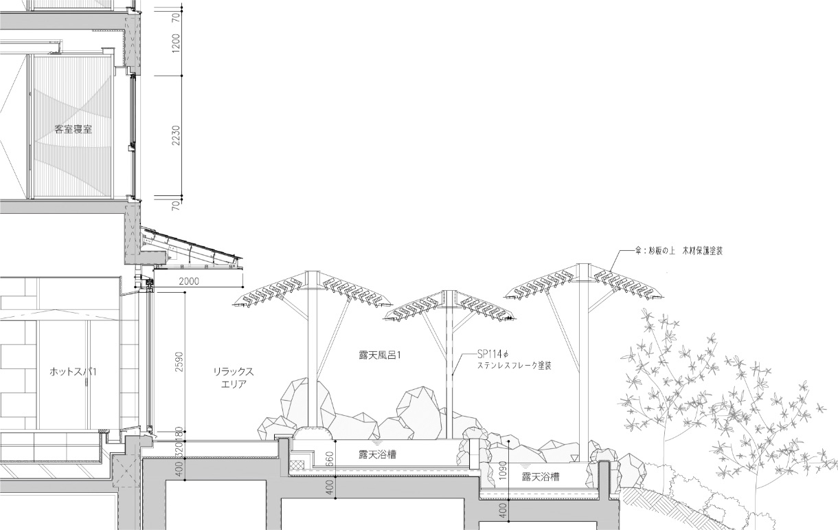 インテリアデザイナーから提示された「林立する傘」を用いて、上部客室から露天風呂への視線を有効に遮蔽する必要があったことから、コンピュテーショナルデザインによるアプローチを行いました。