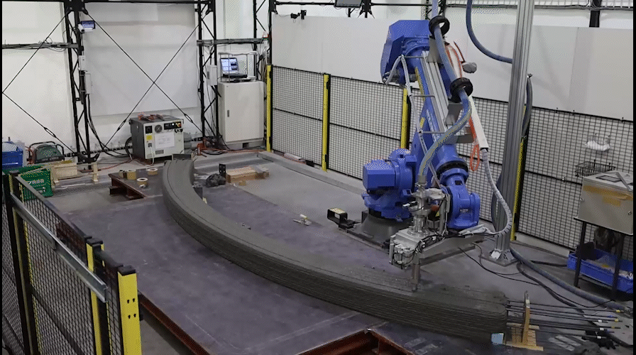 鉄筋を置いた上にロボットアーム型3Dプリンタでプリントして部材を制作していった
