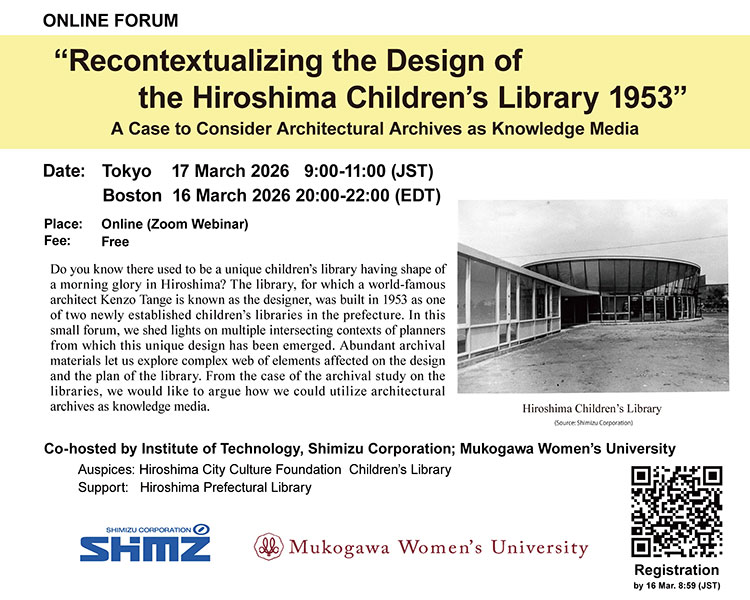 This forum is a part of the collaborative research project: “Archival Study on the Design Process of the Hiroshima Children’s Library” between Institute of Technology, Shimizu Corporation and Mukogawa Women’s University.