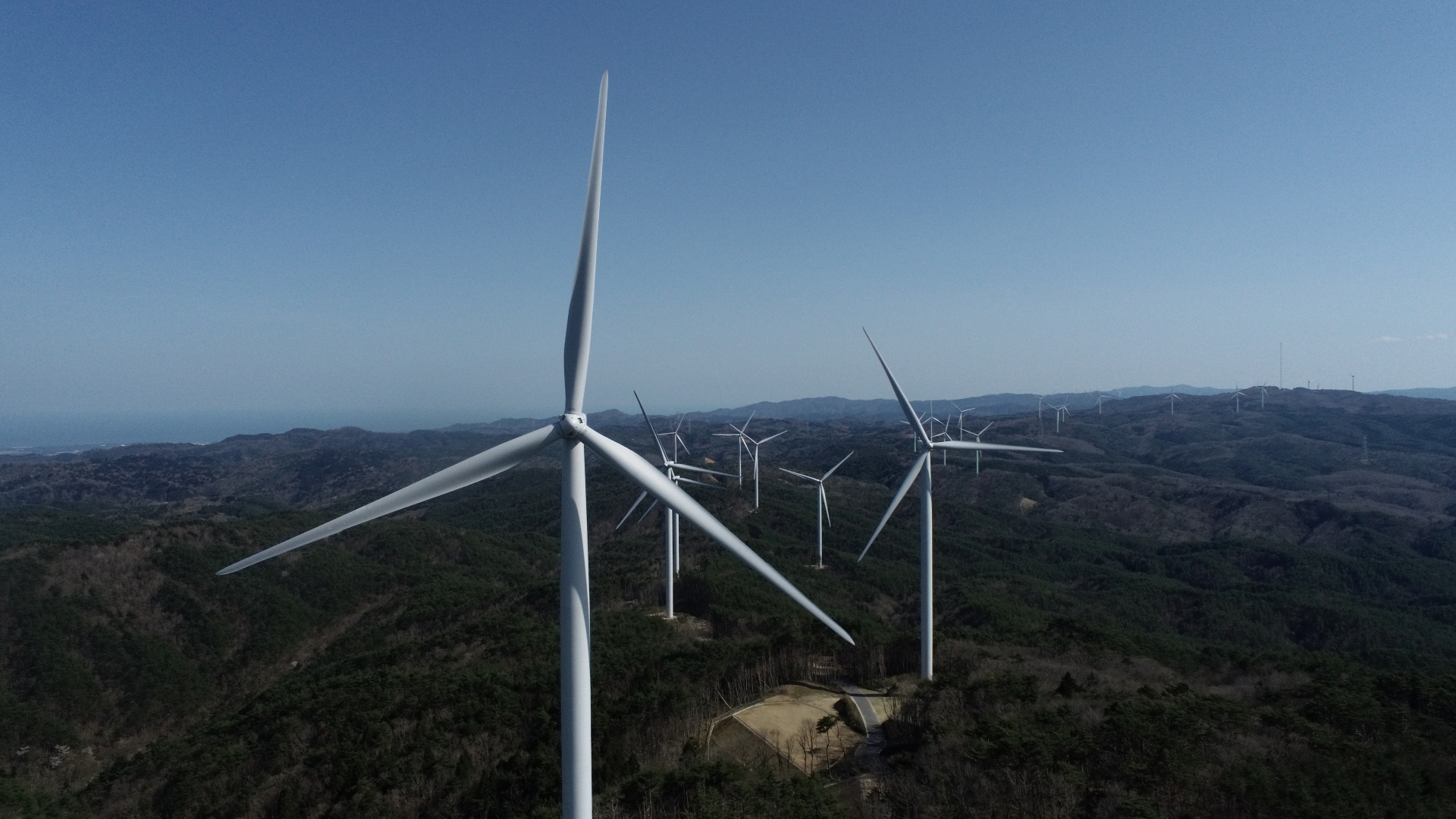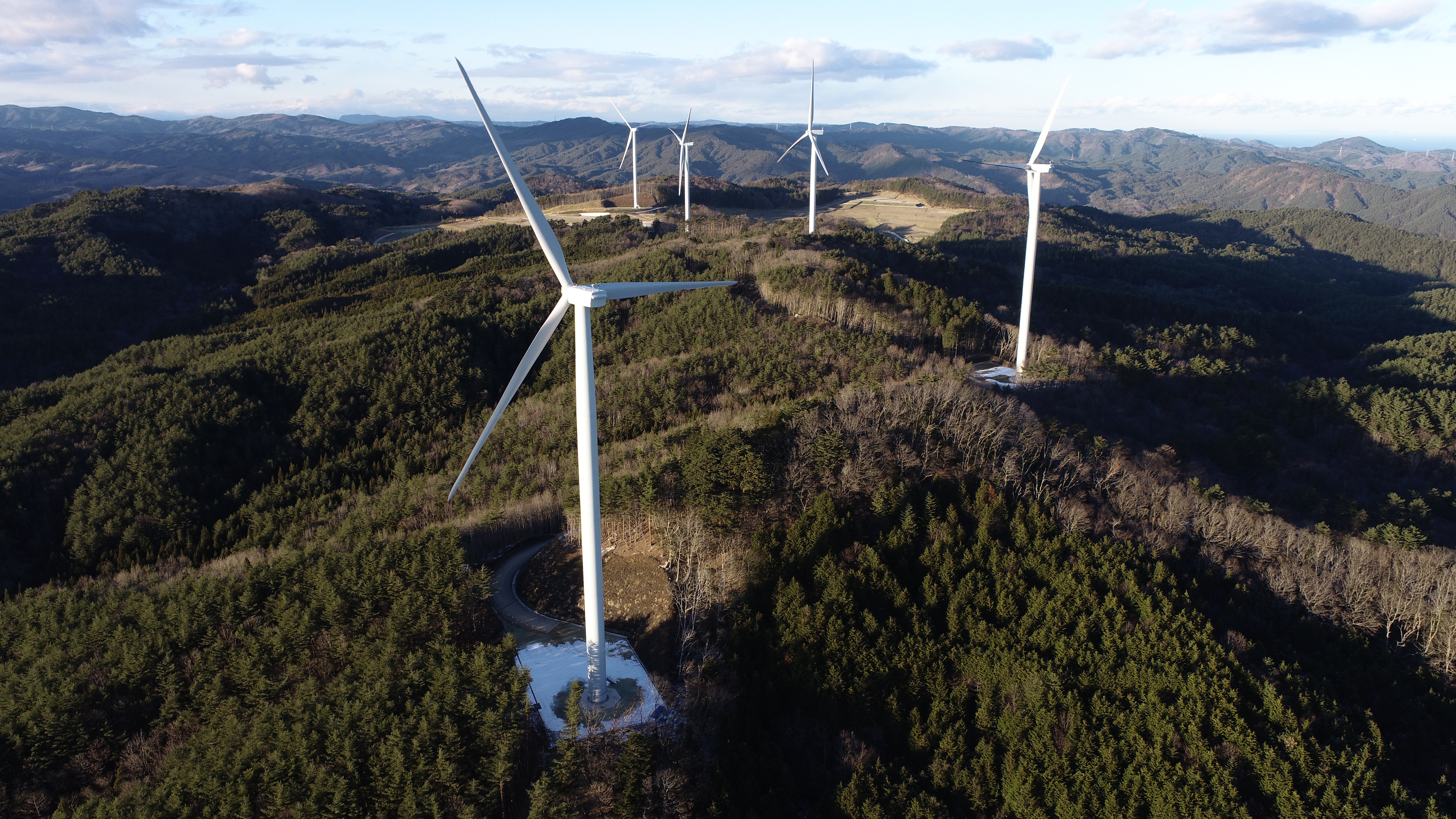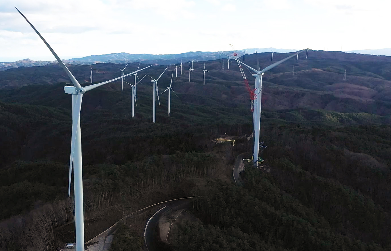 本プロジェクトは岩手県二戸市、一戸町、九戸村にまたがる折爪岳南側の稜線上に風車を建設しました。シミズがEPCとして、風車サイトの設計、風車調達、工事に加え、サイト近傍に事業者様・風車メーカーが使用する管理棟の建設も担当しました。林地開発許可制度の対象となる工事であり、工程上の制約が多い中、東北支店とエンジニアリング事業本部が一体となって手掛けました。新たに造成された作業用道路は、維持管理の観点から、全面舗装されており、風車の羽(ブレード)を寝かせたまま運搬できる設計が特徴です。この道路は一般開放されており、山の維持管理に貢献すると共に、どなたでも風車を間近で見ることが可能となっています。