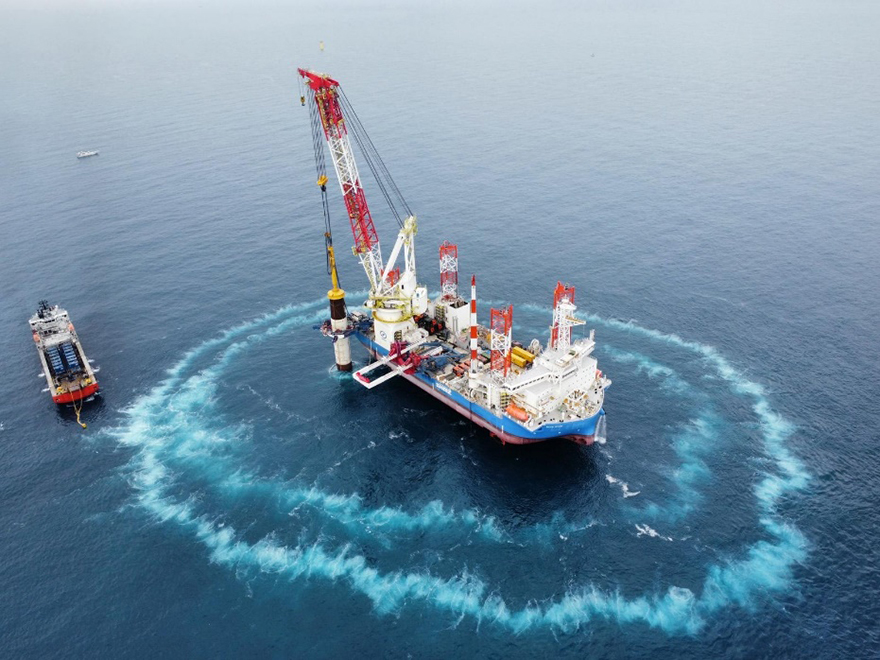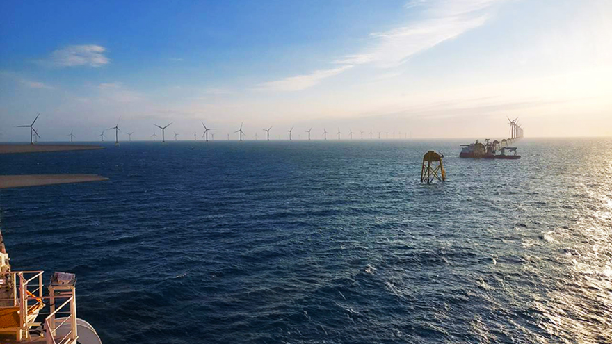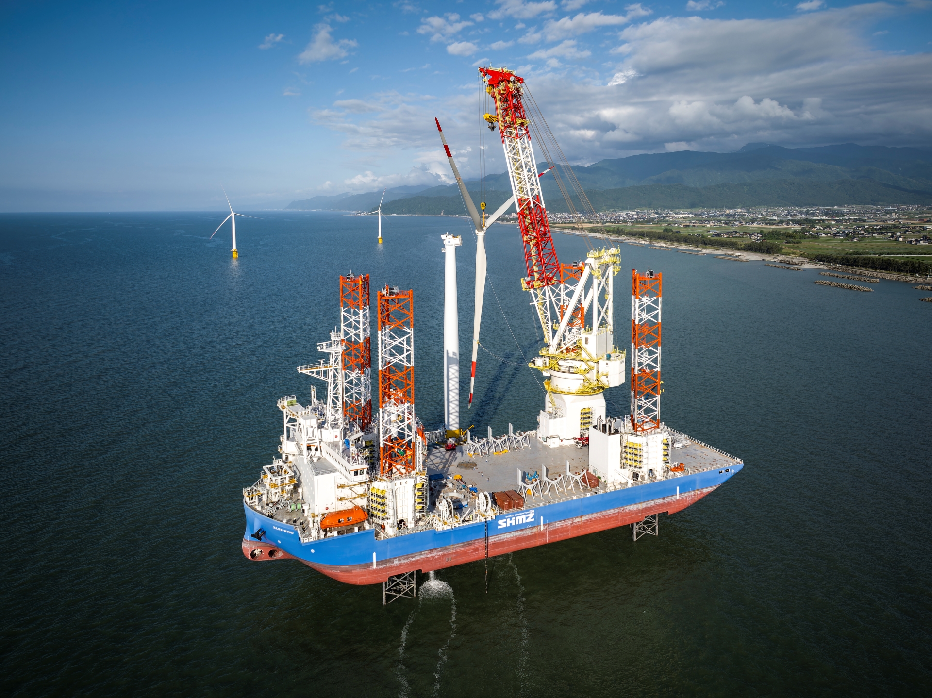 当社は風車のプレアッセンブル・洋上施工および海底ケーブル敷設を担当し、当社のSEP船BLUE WINDを利用して施工しました。