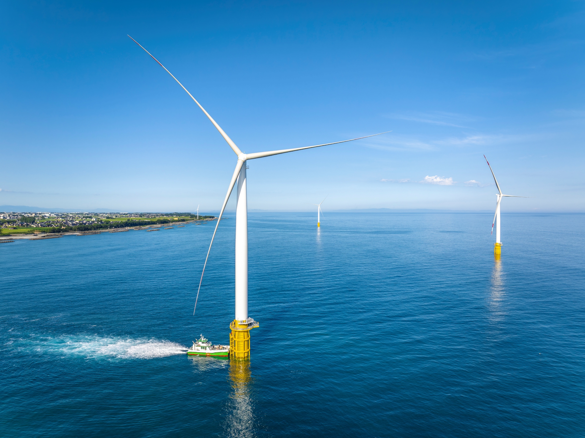 富山県下新川郡入善町沖の洋上風力発電所です。当社が建造したSEP船BLUE WINDを利用して施工した第1号案件であり、当社が設計・調達・建設を一括で担当しました。風車基礎については、モノパイルとタワーを接続するトランジションピースが不要な構造となっており、国内で初めて採用されました。