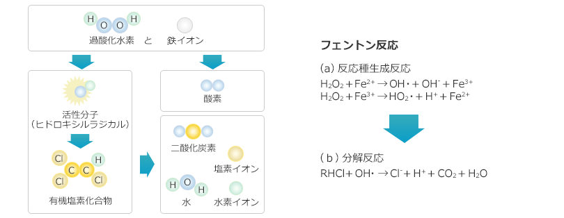 フェントン処理は、揮発性有機化合物(VOC)や油で高濃度に汚染された土壌・地下水に対し、フェントン試薬(過酸化水素と鉄イオン)を帯水層に注入し、フェントン反応によって生成したヒドロキシルラジカルの酸化力により、分解する浄化処理法です。原位置(非開削)で、装置が簡易なため、低コストかつ短期間に浄化処理が可能です。また、シルト率の高い土壌に対しては、攪拌法が適用可能です。