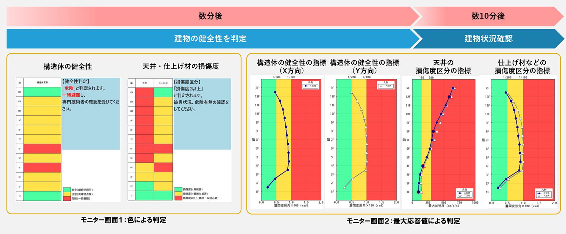 安震モニタリングとは、地震発生直後に建物の健全性を自動で判定し、その結果を建物の管理者や使用者に通知するシステムです。建物に設置したセンサーで常時揺れを計測しており、震度3程度以上を目安としてデータ処理を行い、判定結果を通知する仕組みになっています。人間が定期的に健康診断を受けるように、建物もこのシステムによって「健康診断」を受けているとイメージしていただけると分かりやすいかと思います。