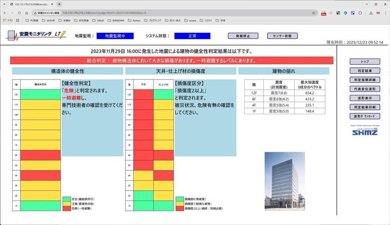 地震後の現場では迅速な判断が求められるため、複雑な解析結果をそのまま表示するのではなく、安全かどうかがひと目で分かる設計にしています。そのため、現場の担当者でもすぐに使えることを重視して開発しました。実際に利用されている方からも「見るべき項目が絞られて分かりやすい」といった声をいただいています。