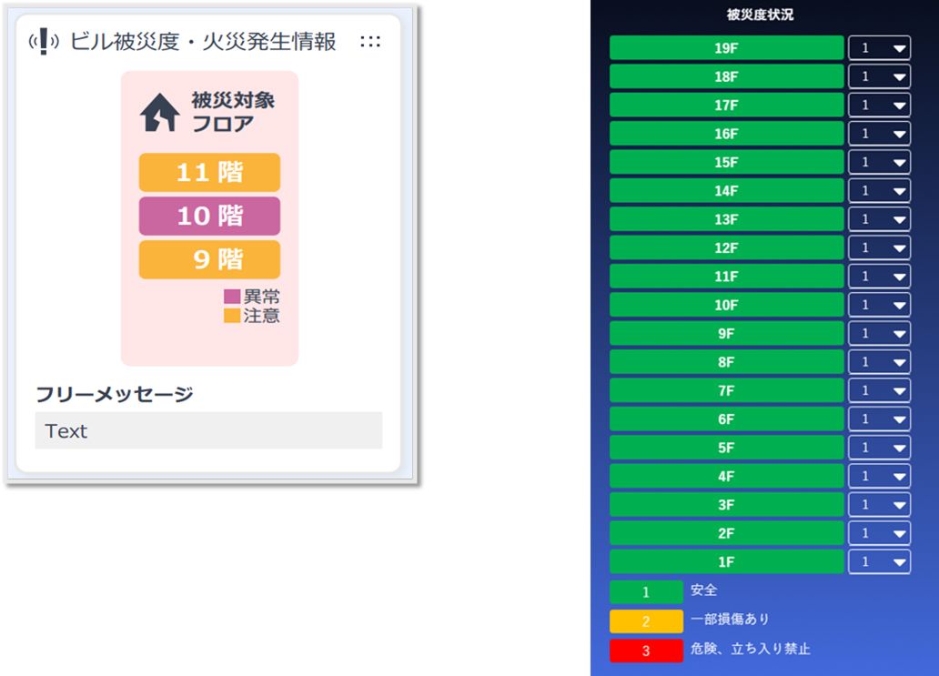 はい、可能です。実際に一部の建物では、DX-Coreのダッシュボード上で安震モニタリングの判定結果を表示し、安全・注意・危険といった状況がひと目で分かる形で連携しています。さらに、サイネージに表示して来館者向けにも情報を共有している事例もあり、警告内容を分かりやすく伝える仕組みとして活用されています。