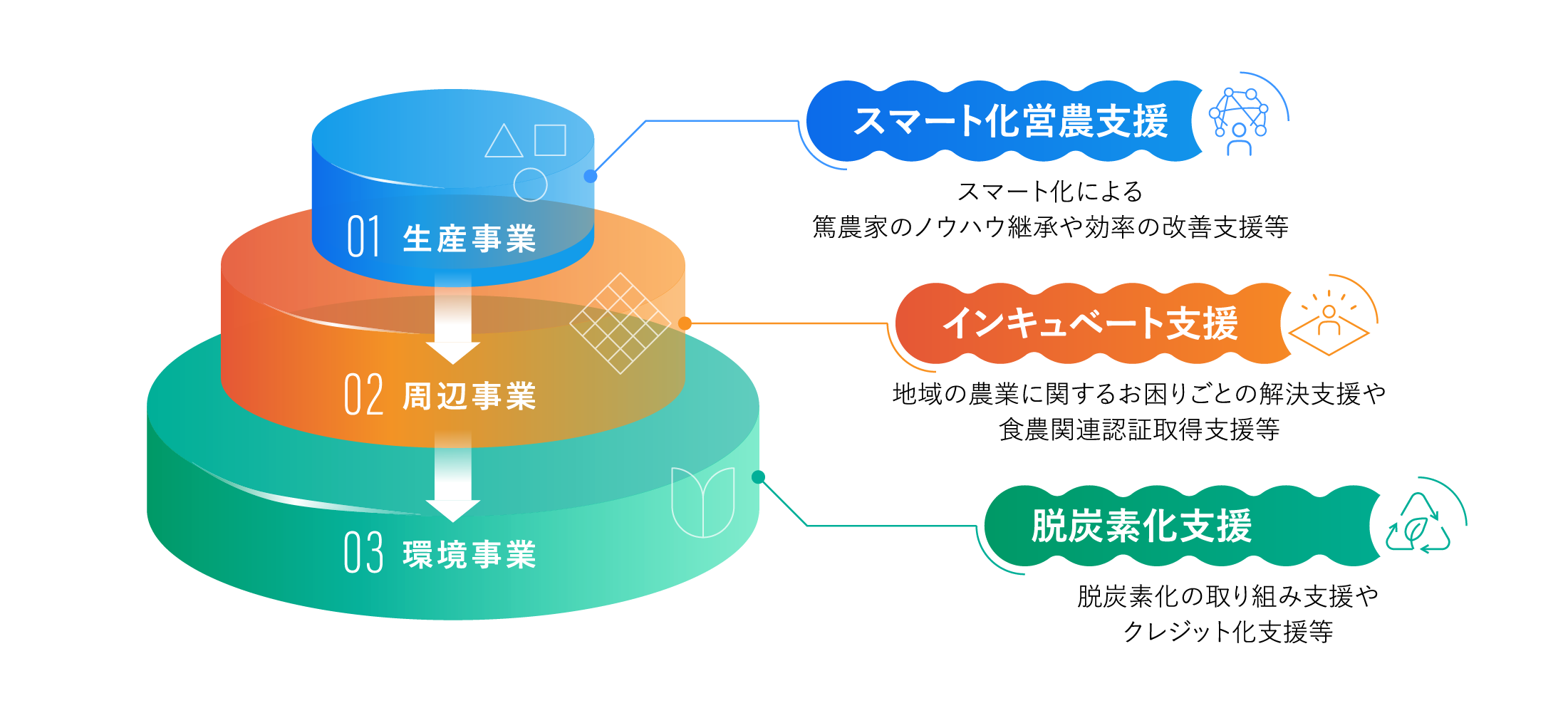 当社では地域の農業に関するお困りごとなどを解決するために、ソリューションの提供や新規事業の創出を支援するインキュベート事業やサービスも行っています。