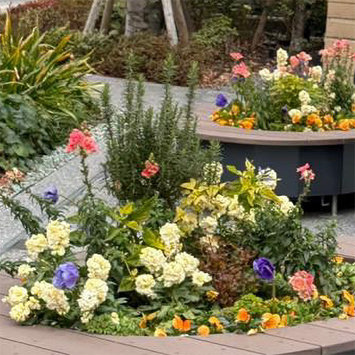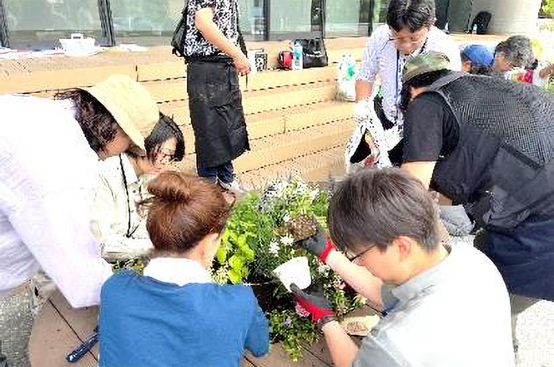 潮見駅前の緑地広場(NOVARE広場)では、みどりネットKoto・NPO法人グリーンワークスと連携して、地域のお庭・コミュニティガーデン活動が展開されています。「菜の花パレット」という可動式のプランターが整備され、従業員や協力会社による日常的な管理に加え、地域にみなさんと一緒に植え替えイベントや緑地の見学ツアーを開催しています。緑地管理で発生した材料を使ったクラフトづくりなど従業員のコミュニケーションの機会にもつながっています。