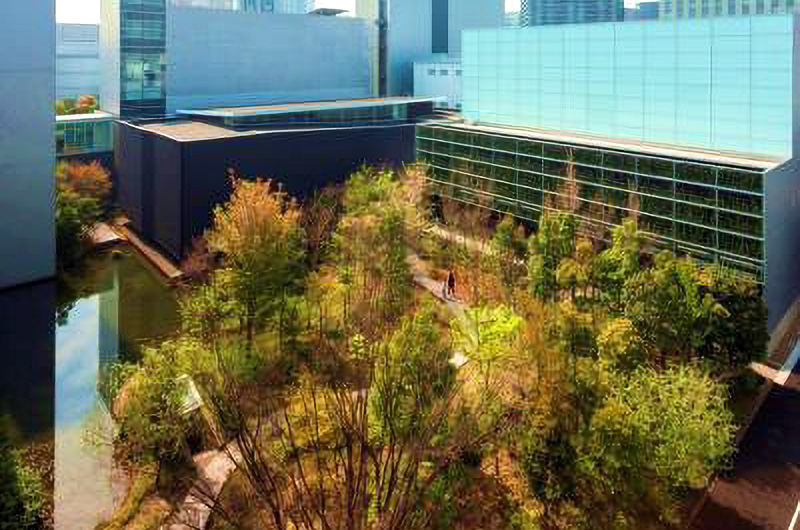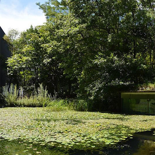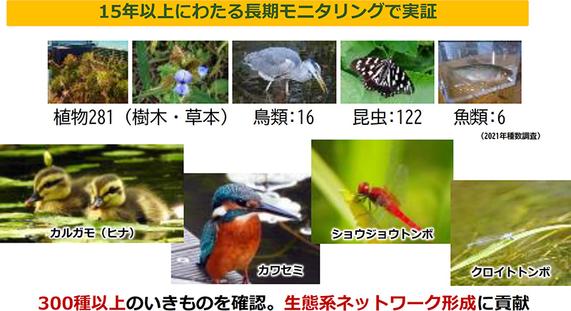 建物跡地に在来種を中心に多様な動植物が生息生育できる約2000㎡の緑地を創出・育成し、15年以上にわたり順応的管理と長期モニタリングを続けています。東京駅から3~4キロにも拘わらず絶滅危惧種を含む300種以上が継続的に確認され、希少な水草が生育する水域には水鳥やトンボ類が頻繁に飛来し生態系ネットワークのハブになっています。