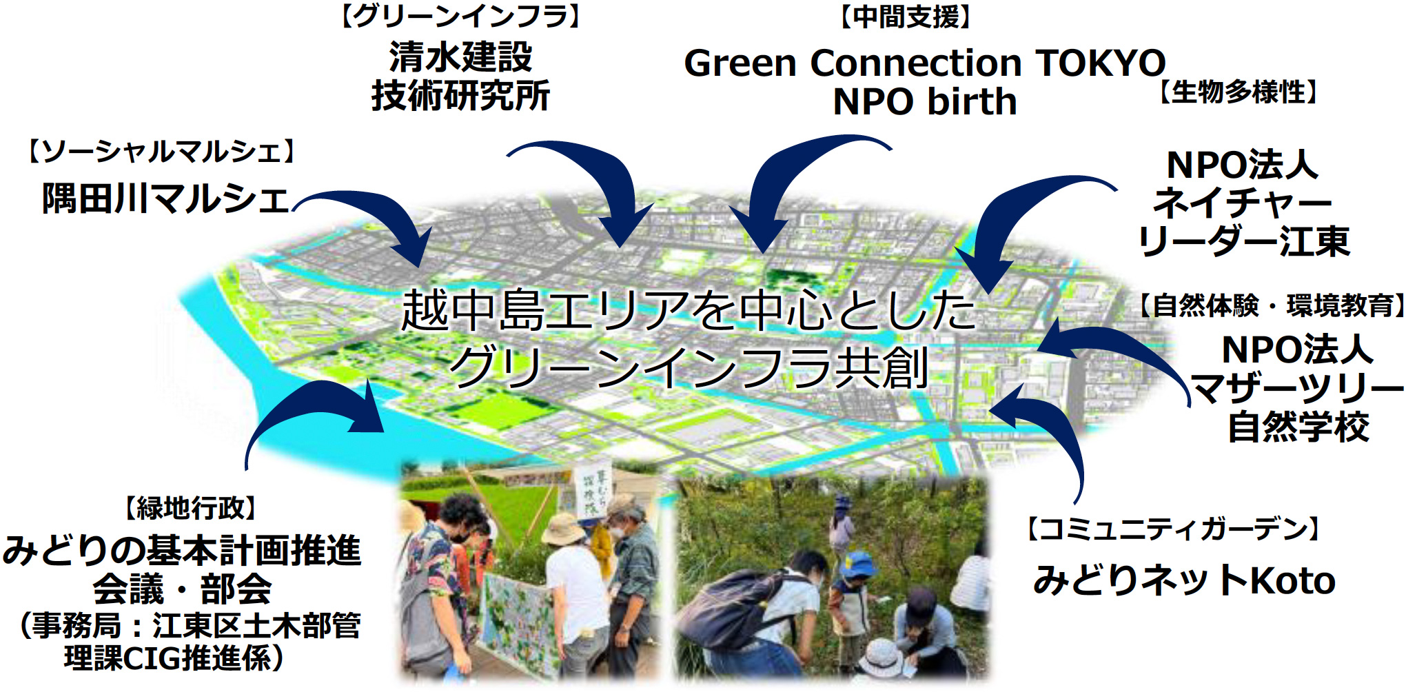 再生の杜を起点として取り組みを地域に広げていくため、越中島エリアを中心に行政・複数のNPO・市民団体、中間支援組織の方々と連携し、公共空間や企業緑地を柔軟に活用した地域共創プロジェクトを進めています。