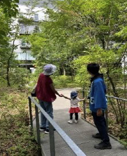 当社と岐阜県立森林文化アカデミーは2019年に連携協定を締結し、環境教育や相互講義などの学び合う機会の創出のみならず、森へのアプローチをしていく上で、2021年にmorinosに「はだしの広場」を整備。はだしでの体験が身体・心理的効果を生み、森林の新たな価値の創造に寄与することや将来の森林保全に資する人財の、意識・行動の変化に繋がることを目的に調査・研究を行いました。現在は、都市部にいる方々にも森の入口をつないでいきたいという思いから、グリーンインフラ地域共創の一環として、子どもたちから大人の方まで多くの方々に「はだしのトレイル体験」の場を提供しています。