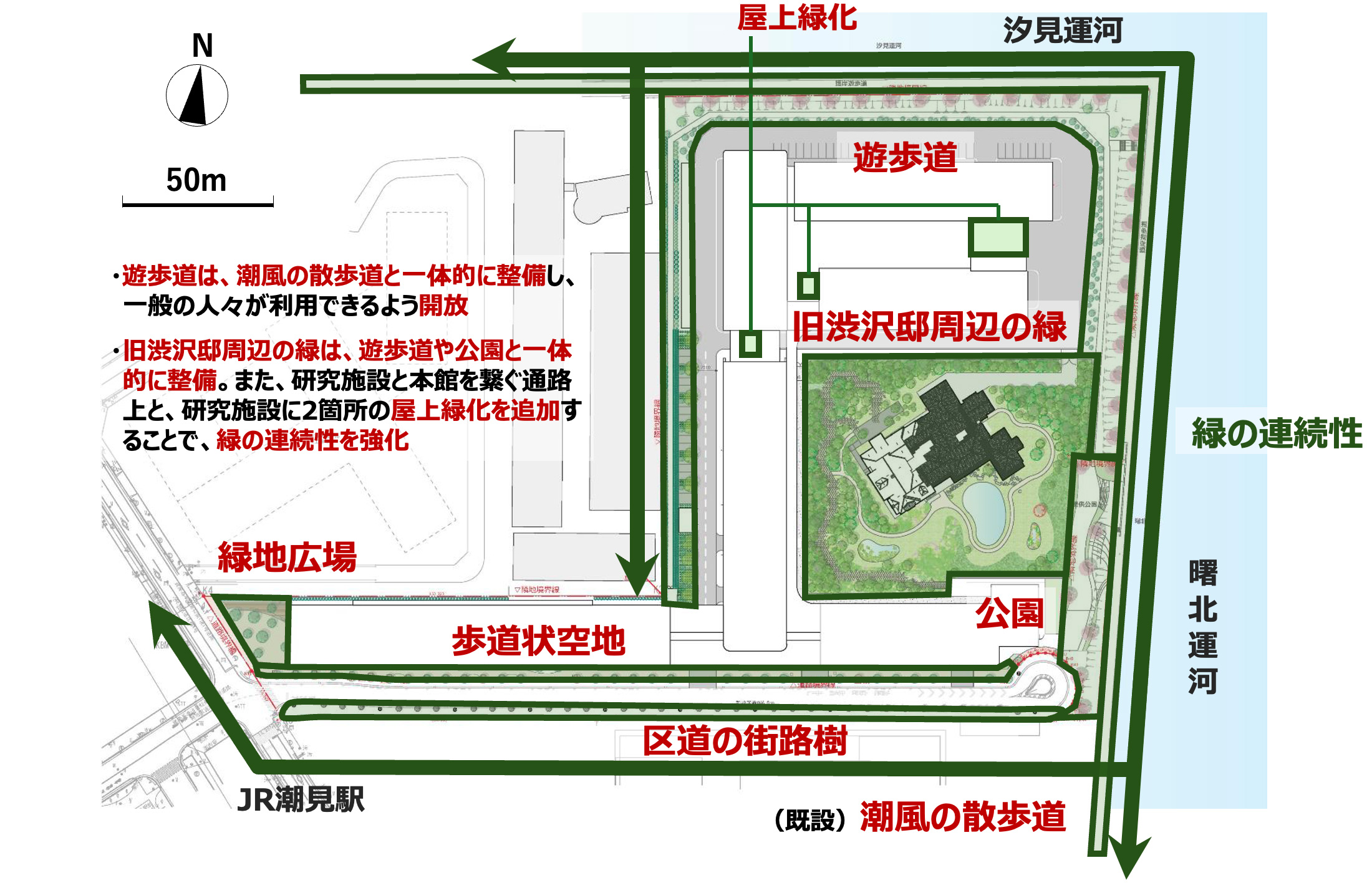 約40,400㎡の敷地のうち9,516㎡を緑地として、生物多様性に貢献する場を整備しています。また旧渋沢邸周辺の緑や遊歩道(NOVAREウォーク)、公園(潮見しぶさわ公園)、潮見駅前の緑地広場、歩道状空地等、緑の連続性を意識して、地域の方々が日常的にアクセスしやすいウォーカブルな環境や交流拠点として活用可能な場を整備しています。