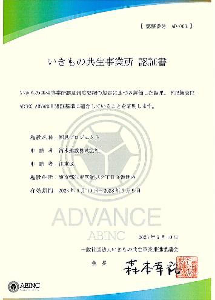 ADVANCEは、一般社団法人いきもの共生事業推進協議会が運用する緑地認証のひとつです。緑地を活用して地域課題を目指し、複数街区で構成された開発事業について、生物多様性に配慮した緑地を保有・維持管理され、SDGsに関する取組がなされる事業に与えられます。