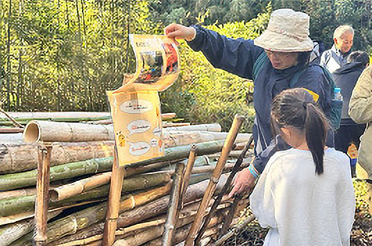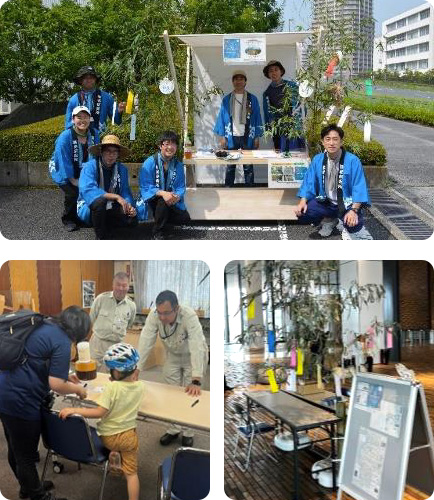 その代表例が、まちなかの七夕飾りをめぐるスタンプラリー「七夕めぐり」(主催:隅田川マルシェ実行委員会)です。七夕飾りの竹材は、しみず谷津の放棄竹林の伐採材を利用し、江東区内70ヵ所程度の七夕めぐりスポットで配布・展示し、地域の交流や賑わいの場づくりに貢献しました。自社施設も七夕めぐりのスポットとして特別公開し、近隣の子どもたちや親子連れ等の自然共生やまちづくりを体験してもらいました。