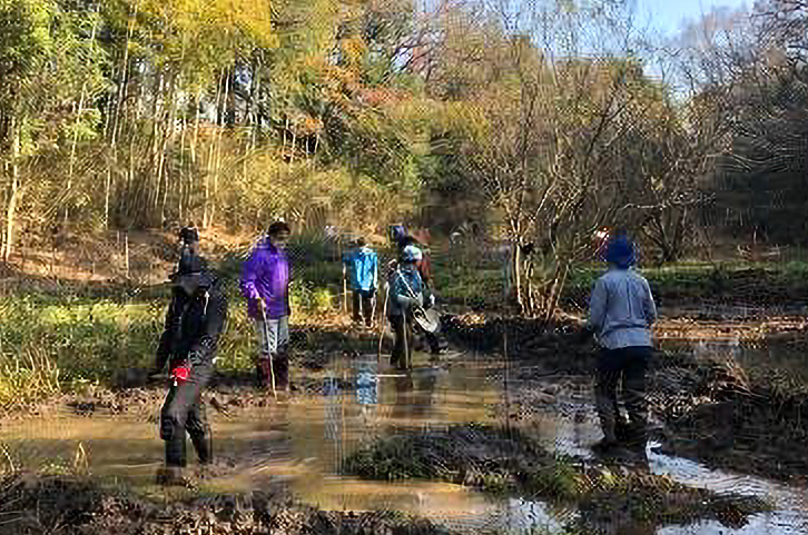 八ツ堀のしみず谷津(千葉県富里市)は、清水建設が中心となり、NPOや研究機関、大学、行政などと連携し、荒廃した谷津※1(やつ)を再生するプロジェクトです。2021年から谷津特有の湧水を活かし、治水や水質浄化、生物多様性、環境教育など多機能な「湿地グリーンインフラ」の整備・活用に取り組んでいます。