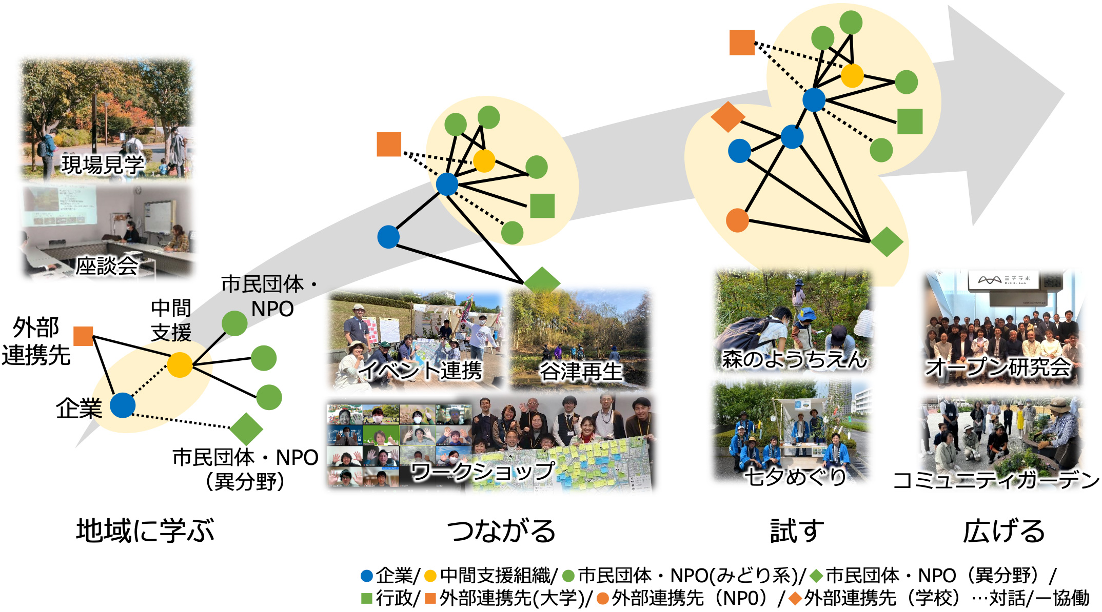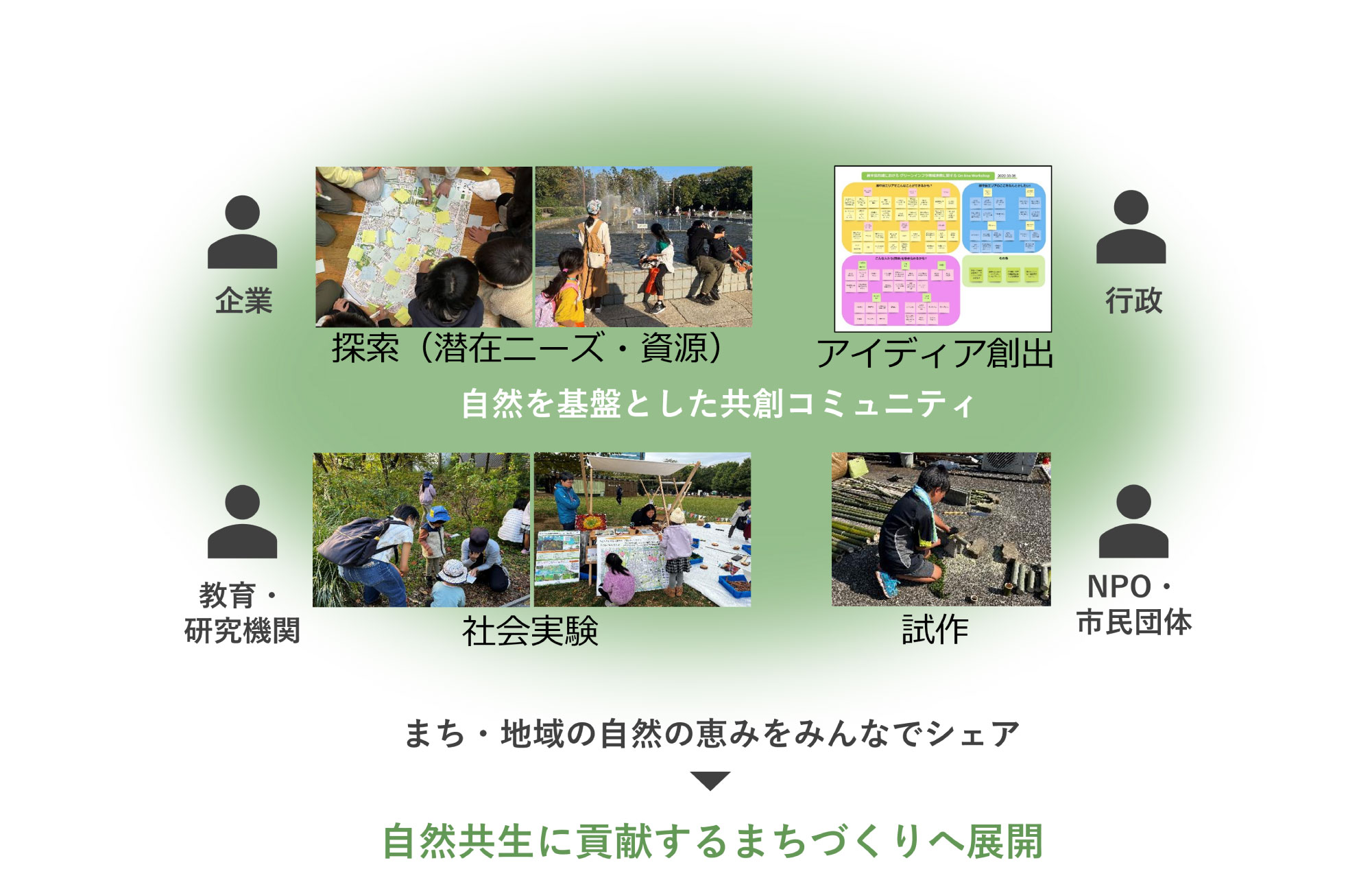 企業と行政、地域NPO・市民団体、学校などが協力し合い、地域共創を実践していくためには地域のステークホルダーが“顔の見える”対話・連携の場をつくり、自然を基盤とした共創コミュニティを育むことが重要です。