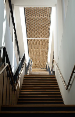 研修生間の自然なコミュニケーションが誘発されるよう、研修室を取り巻くホワイエは、空間プロポーションや開口部、家具や照明が変化しながら、回遊性を持ちヒューマンスケールなシークエンスの連続として計画されており、さらに外装の熱処理木材ルーバー、CLT構造の中門ゲート、国産樹種を多用したインテリア、CLTパネルによる3次元の家具など、多様なアプローチから国産の“木”を使用しています。