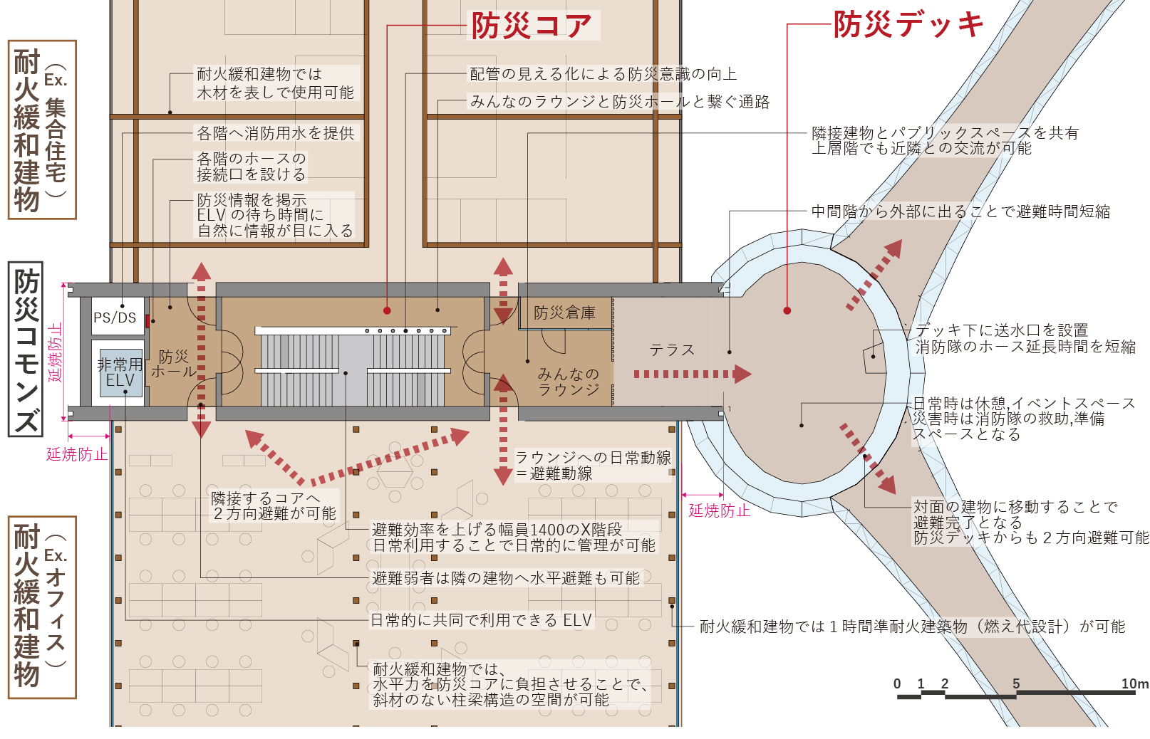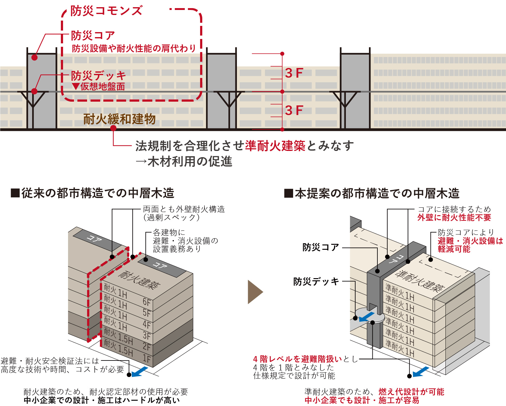 本提案は木造建築を防災コモンズで挟みこむ構成になっています。防災コモンズは防災コアと防災デッキで成り立っています。防災コアは隣接する木造建築が備えるべき防災設備や耐火性能の肩代わりする機能があり、防災デッキは避難経路にもなる仮想地盤面として扱われます。防災コモンズによって挟まれた木造建築は、耐火建築とすべき規制が合理化された「耐火緩和建物」となり、準耐火建築として計画が可能になります。