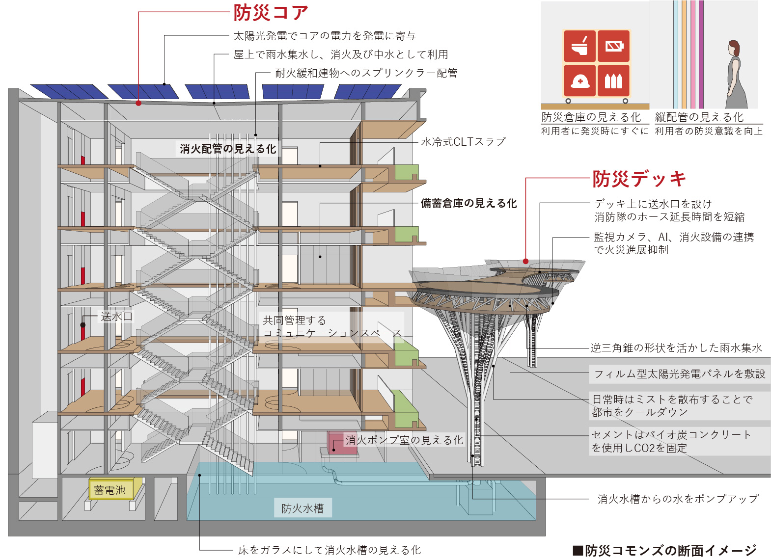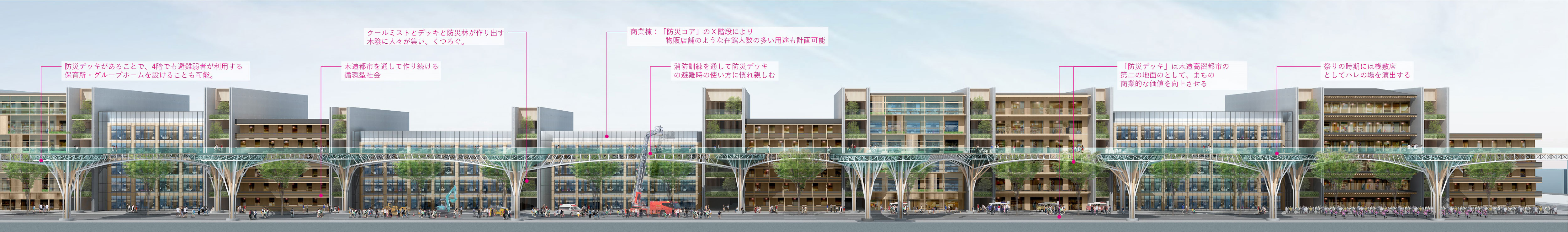 本提案は「2024年度日本建築学会技術部門設計競技:木材を活用した建築物・都市における革新的な火災安全技術とデザイン」で最優秀賞を受賞した提案です。木材を活用した建築物・都市における革新的な火災安全技術とデザインが求められました。私たちは「防災コモンズ」と呼ばれるコアとデッキを設け、防災力をハード・ソフトの面から共有することで、木材利用のハードルを下げ、それにより都市の木質化が促進されるシステムを提案しました。
