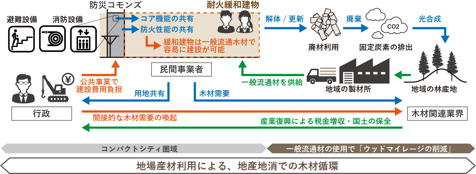 民間事業者は木造で建物を建てることを条件に、敷地の一部を行政に提供し、行政が公共事業として防災コモンズの建設を行う仕組みを提案しました。「防災コモンズ」によって、間接的に木材需要が喚起され、行政・民間事業者・木材関連業界の経済循環が起こります。耐火緩和建物では防耐火性能の合理化により、国内各地で調達可能な、無耐火の木材の活用もしやすくなり、県産材や流域材といったスケールでの、木材の地産地消にも繋がっていきます。