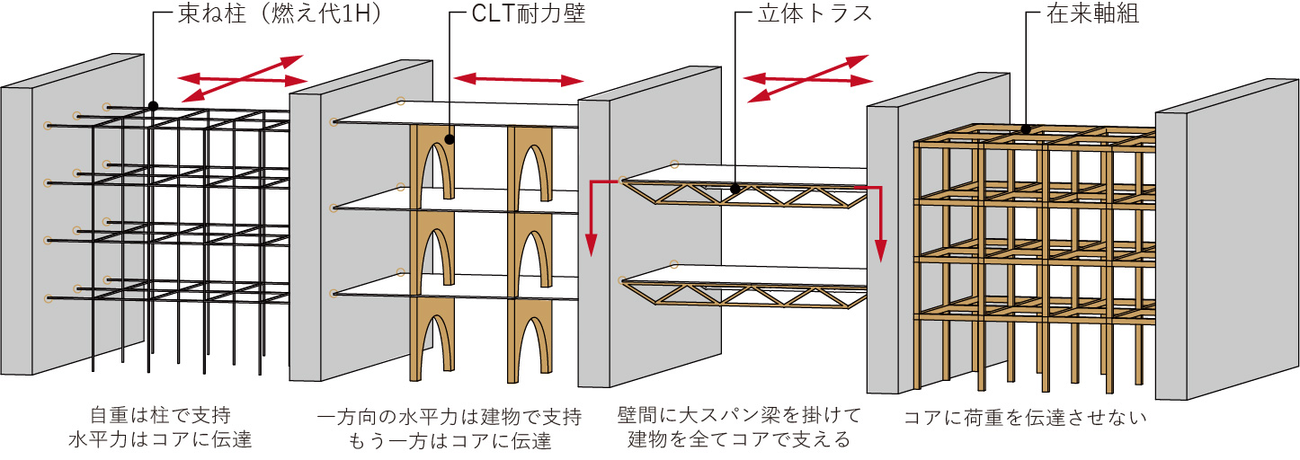 防災コアには隣接する耐火緩和建物の水平荷重を負担させることが可能です。水平荷重の一部、または全部を防災コアに負担させることで、従来は実現が難しかった架構形式の建物を作ることもできます。耐火性能は1時間準耐火を満たせばよいので、燃え代設計によって無耐火の木材を表しで使うことが可能になります。