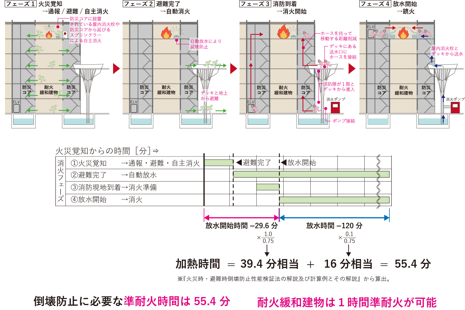 耐火緩和建物を1時間準耐火とみなして問題がないか検証をしています。スプリンクラーや放水ロボットによる継続散水や防災デッキへの避難、消防活動の拠点として利用、非常用エレベーターの使用により、放水開始までの時間が短縮されます。検証法に基づく計算により、耐火緩和建物は1時間準耐火としても問題ないという結果となりました。