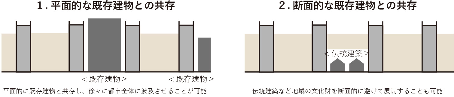 防災コモンズは都市の隙間や未利用地などの狭い敷地に対しても適用可能なため、様々な既存都市への展開が可能です。平面的に既存建物と共存し、徐々に都市全体に波及させることや、伝統建築など地域の文化財を断面的に避けて展開することもできます。