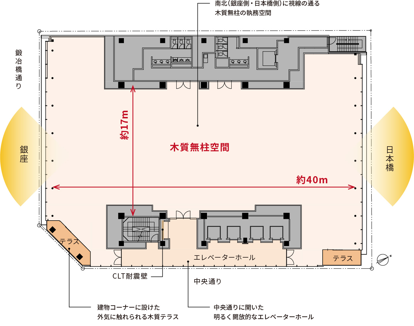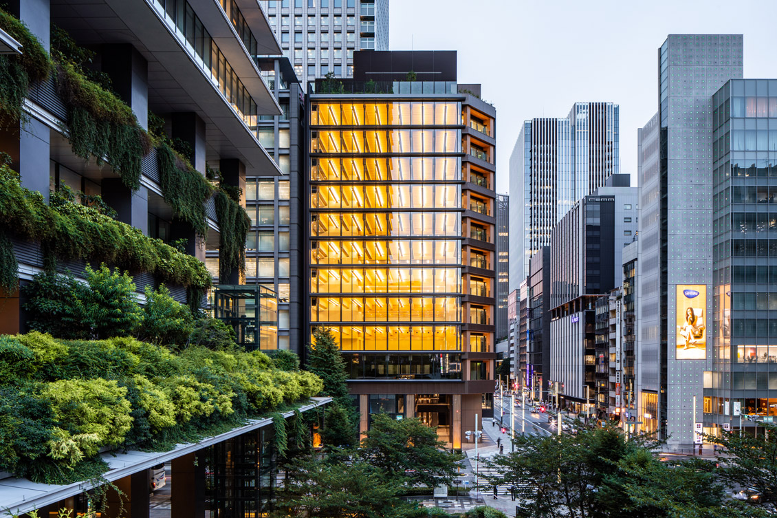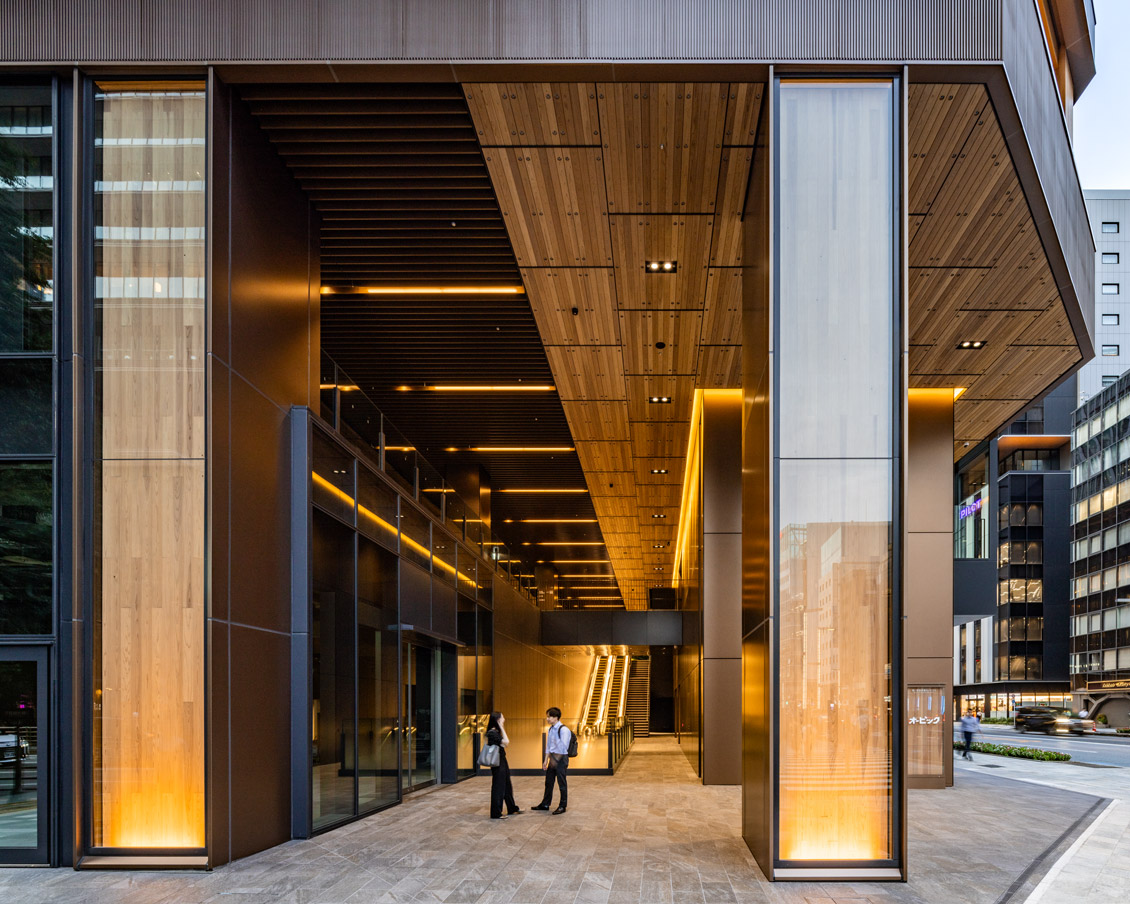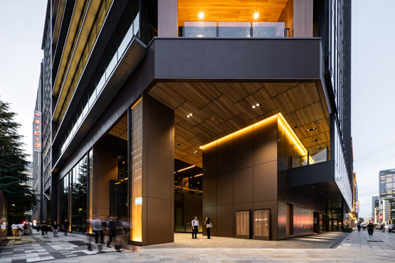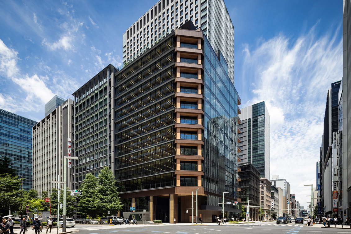 『第一生命京橋キノテラス』は、日本橋・銀座をつなぐ中央通りと鍛冶橋通りの交差点に面し、視認性に優れ、東京メトロ銀座線「京橋」駅と直結した地上12階・地下2階のテナントオフィスビルである。「Well-being × Sustainability」をコンセプトに、木造と鉄骨造の長所を組み合わせ、木の存在を感じられる開放的なファサードと、施設利用者の健康や生産性向上に寄与する快適な空間を実現。耐火集成材や耐火木鋼梁を用いて、40m×17mの木質無柱空間として執務空間を形成している。