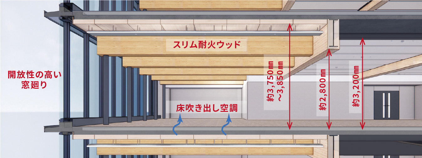 木に囲まれた快適な執務空間と外気に触れられる環境づくりを目指し、建物の内装に木材を用いるとともに、各階にテラスを配し、施設利用者のウェルビーイングに貢献している。建物の主要構造部の天井や梁に使用した木材を積極的に表し、リラックス効果や生産性向上効果のある快適な執務空間を実現している。