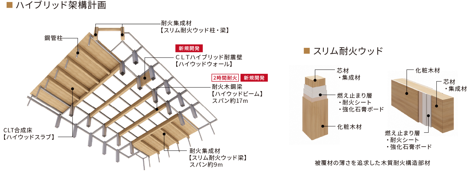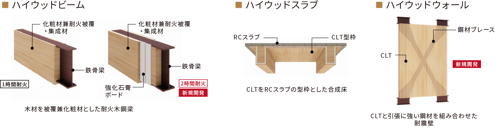 ・スリム耐火ウッド 柱・梁(1・2時間耐火) ・ハイウッドビーム(1・2時間耐火) ・ハイウッドウォール ・ハイウッドスラブ |