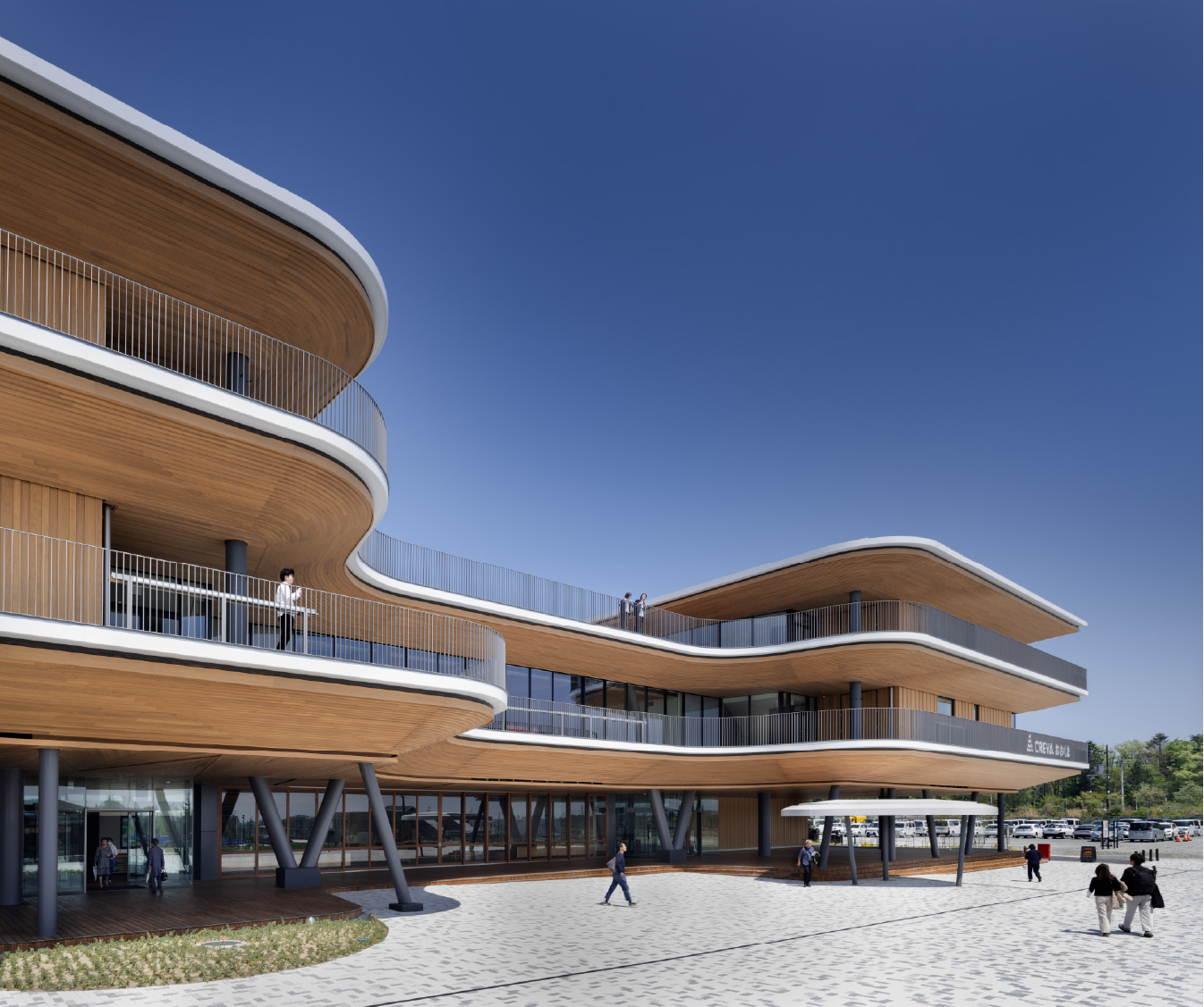 木と鉄を組み合わせた構法により、まちの豊かな自然や発展の眺めを楽しめるテラスで幅25mのパノラマビューを実現した。夜間は軒天や外壁、バルコニーのカウンターテーブルなどを暖色系の光で照らし、駅前の街区や道路を含めた統一的な照明計画を採用している。