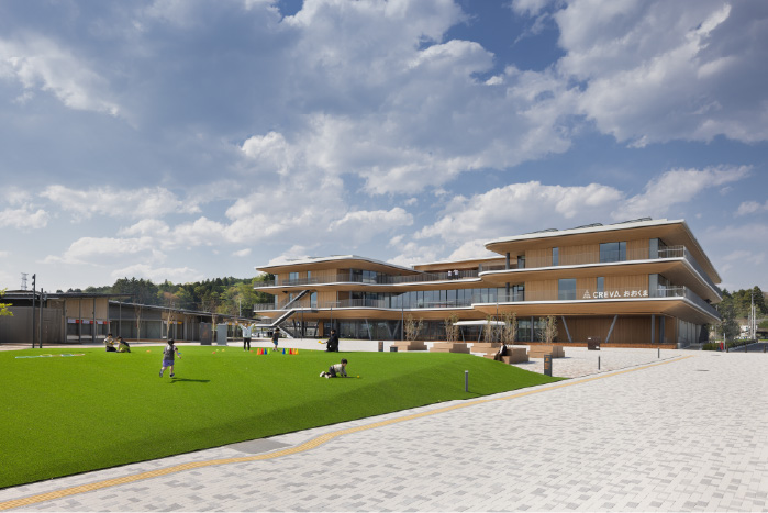 大熊町産業交流施設(愛称:CREVAおおくま)は、大野駅西地区の復興を牽引する拠点として設立された。地元産業の復興や地域で求められるオフィス需要の受け皿となり、長期にわたって新たな産業を創出することを目的としている。施設は地元住民、働く人、来訪者が集う場として木材を積極的に採用して居心地のよい「町のリビング」を目指し、かつて林業が盛んだった町の歴史を継承する役割も担っている。