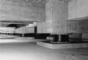 本館の重量は約1万トンありましたので、直径35センチの鋼菅杭150本を仮受けとして使用し、49本の柱の下に免震装置を取り付け、最後に鋼菅杭を撤去しました。