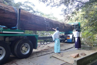 4本の杉材は、太さ、曲り、傷などを検査確認して、15m~17m程度に切断され、トレーラーで山形県の加工場へ搬送しました。