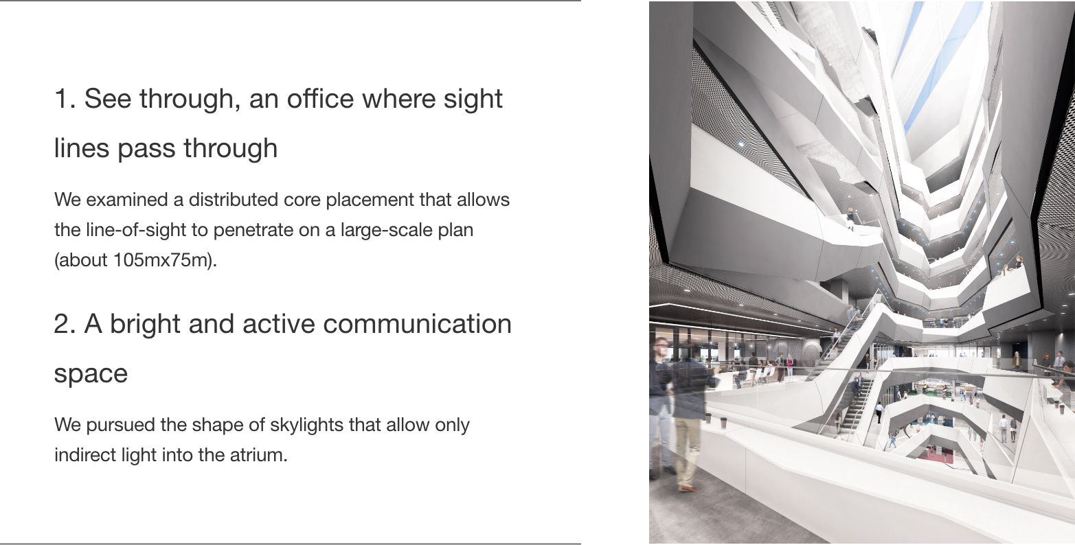 In continuously evolving times, the sites and functions that are required by architecture and space will change from moment to moment. This is an office building that responds to and accepts such changes. Introducing the digital design of an atrium space that illustrates "human- and environmentally-friendly architecture."