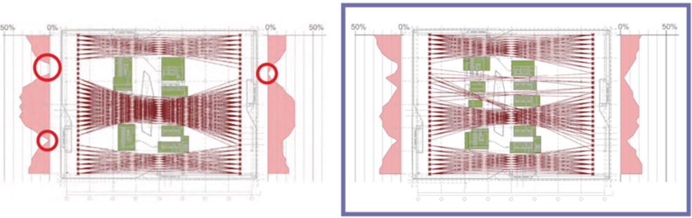 The part that becomes a "valley" where the opposite tenant cannot be seen at all (left) and the improved plan by studying the position of the core (right)