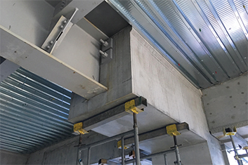 企画設計段階の2015年当時、鉄骨単価が上昇していたが、鉄筋単価は下がる市場傾向にあった。RC造にすればローコスト化が図れることは容易に想像できたが、工期が延びるという課題が残った。そこで、外周部のRC柱と梁をすべてPCa化して鉄骨造と同じ工期となるよう、企画段階から施工検討を進め、設計に反映させ、PCaの断面形状を統一、単純化し、接合部はグラウト継手方式による配筋作業の最小化を追求した。また、PCaを積層させることで生じる柱と梁の施工誤差を吸収するため、フロアごとに深く目地を取り、そこに水切りを通してメンテナンス性も向上させた。その他にPCaのストックや搬送時の専用重ね治具を用意し、その据付部をPコン跡のようにして、ものづくりの痕跡を残すデザインを施した。シミズPS-HyECOS構法を完全PCa化することで、均一で高品質な構造躯体と力強いファサードを、さらに作業員省人数化による生産性の向上を実現した。