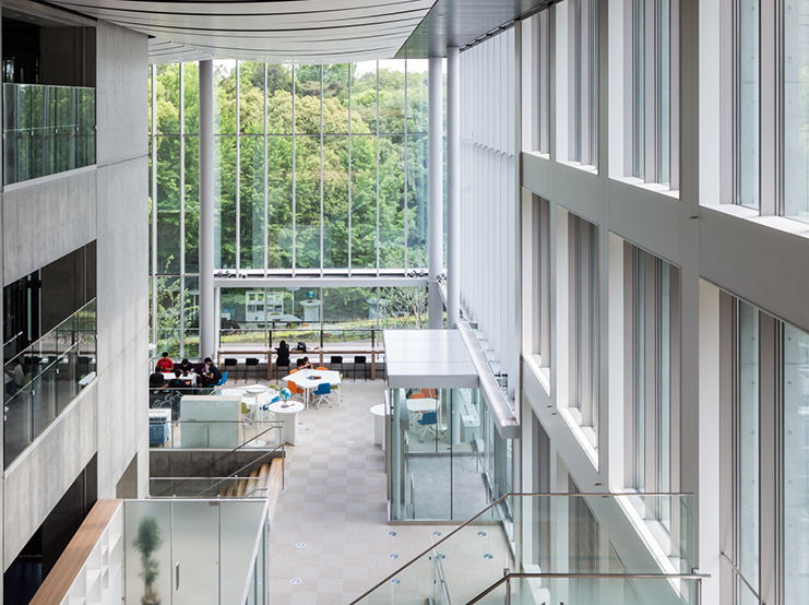 計画地の特徴や50周年の歴史が育んだ圧倒的な自然を取り込み、一枚の大屋根の下で「アトリウム」「講義棟」「既存図書館」を繋ぐことによって、開放的でシンボリックなコミュニティプラザを創出した。