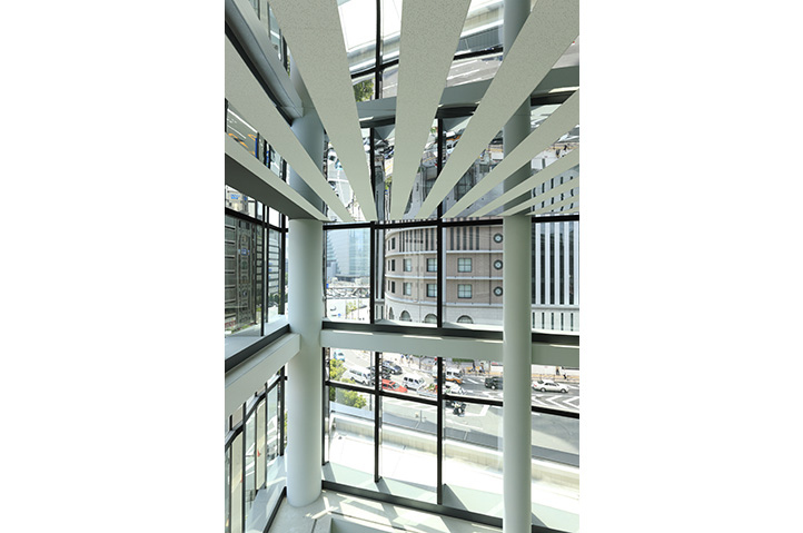 都市再生特別地区による既存オフィス建替。梅田駅前の7本の道路が交差する辻に面し、ランドマークとなる都市景観を創出した。ガラス面が細かくランダムに広がっていく低層部は大地に根を下ろす大樹をイメージし、「フコク生命の森」というアトリウムを覆う。角度の違うガラス面の織りなす映り込みを透過した光は、ブナの森に見立てたアトリウムに樹海の木漏れ陽のように降り注ぐ。