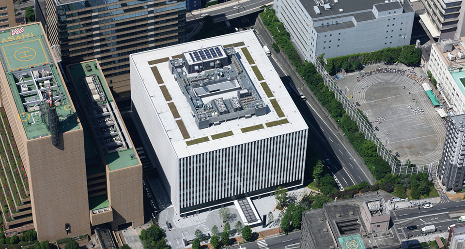 国交省関東地方整備局・東京国税局発注のPFI事業。都市部における環境調和型庁舎のプロトタイプとして基準階面積を最大限確保し、階数を抑えることで高レンタブル比を実現した。5つの吹抜を利用して、自然換気と自然光の導入を行い、CO2排出量を大幅に削減した。中間期には、外壁PC打込の換気ホッパーから自然通風を取り入れ、廊下を経由し、吹抜に面した電動開閉窓から排気される。吹抜上部には、太陽光追尾装置を設置し下階に光を導いている。基準階には廊下に面したオープン階段、リフレッシュコーナー、打合せカウンターなどを設け、職員間のコミュニケーションを誘発するスペースとした。外部は道路に面し、地域に開放するまとまったオープンスペースを設け、既存樹木の保存と隣接する敷地の樹木とともに築地の杜を形成した。