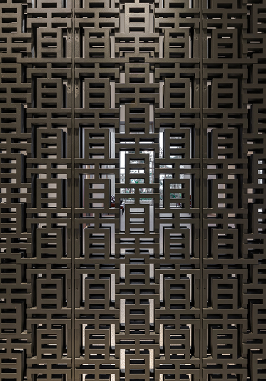 現地の意匠や素材を内外のデザインに取り込み、品格ある高級感を演出した。ファサードには、伝統模様である琉球かすり柄の意匠を展開した。グリッドに織りなされるフレーム構成の変化が、端正で美しいリズムを感じさせる。エントランスアプローチには、古くより沖縄で使われている琉球石灰岩を外壁や基壇に用いた。石灰岩の淡い地色に南国特有の色彩と植栽の緑を配し、来訪者を出迎える設えとしている。ロビーとラウンジには、市の花「サンダンカ」をモチーフにしたシャンデリアを設けた。また宜野湾の「宜」をかたどったデザインをニッチに施した。2層吹抜けの開放感あふれる空間に、照明の煌きが華を添え、邸宅のステイタスを醸し出している。