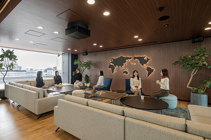 名古屋港に拠点を置く愛知海運の創業80周年を記念した本社建替計画。部署間の連携・社員同士の積極的なコミュニケーションが生まれるオフィスを目指し、オフィス全体を緩やかに繋ぐ『コミュニケーションデッキ』を計画した。4層を繋ぐ大階段と、その周囲に散りばめられた、パントリーやライブラリー等の交流空間で構成されるデッキは、自席以外の居場所として、仲間との交流や、打合せ、集中作業等、多様な働き方を受け止める余白として機能している。 創業当時の機帆船を表現した木のギャラリーエントランスや、コンテナや世界地図等、海運業らしさを表すモチーフを取り入れたインテリアは、社員と意見交換をしながら設計を進めた。多くの社員が、自らの生活の場をデザインするため積極的に意見を出し、設計者と社員で協働して、通いたくなるオフィスづくりを目指した。