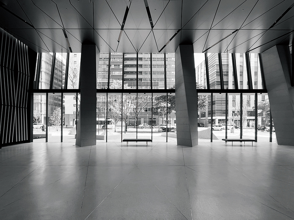 敷地周辺はかつて商業も栄えた寺町である。現在の商業・業務の中心である天神地区と差別化を図り独自の魅力を発信することがデザインのテ-マであった。建物外周に空地を整備することで、沿道の活性化の仕掛けや歩行空間の拡張等による市街地環境の改善を図った。人々の動線・視線と九州にゆかりのある植栽を交錯させ、また抑揚のある柔らかな照明計画により、憩いとくつろぎの場としている。外装は博多織をモチーフとした波形のガラスカーテンウォールが前傾した形態をしている。クリスタルのような外装は、反射する光や陰影、街路の写り込みが刻一刻と変化し、新しい都市の風景を創出している。外構を含めた内外装の要素を共通のデザインコードで統合し、全体の一体感の向上を図った。また素材の質感や手仕事感のある仕上げにより、光の反射と陰翳を感じる空間とした。