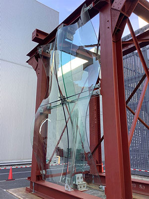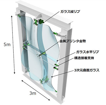 そこで、当社が開発したのが3次元曲面ガラススクリーン構法です。施工時に化学強化合わせガラスで成形した曲面ガラス部材と支持部材を構造接着剤で固定する構法で、支持部材の構造を最適化することにより、現場での調整を少なくでき、施工精度を確保しながら取り付けの手間を低減することができます。