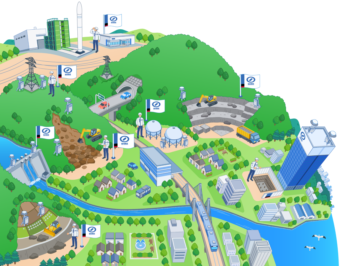 全球測位衛星システム(GNSS)を用いた高精度動態観測サービス「QuartetS」を東京海洋大学と共同開発しました。観測点の微小な位置変化を常時計測し、建設現場の変位監視やインフラ保全に活用しています。