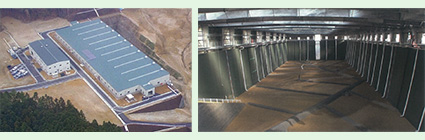 埋立量(約20万m3)の被覆型最終処分場です。場内には埋立て物を投入する移動式のホッパー(右写真)が設置されています。