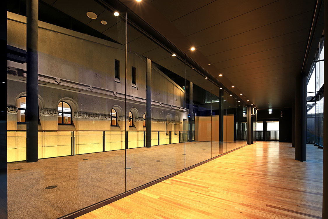 今回の工事は、京都市の本・西・分庁舎すべてが接続する重要なフェーズでした。道路に面している部分はスロープの一部のみ。免震構造の建物を増改築するため、仮拘束や解放を見込んだスペースの確保など複雑な手順を求められましたが完工できました。